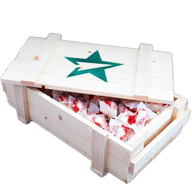 Подарочный ящик из 100% массива сосны и целых 300 грамм первоклассных конфет Raffaello внутри с наутруальным наполнителем. Крышка ящика притягивается двумя джутовыми лентами.